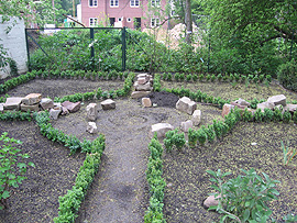 Einen Monat später: Der Buchsbaum ist gut angewachsen, und im Zentrum entsteht eine Kräuterspirale
