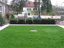 Nach dem Neubau unterirdischer Gebäudeteile sollte der Garten neu angelegt und eine neu gebaute Terrasse gestaltet werden.