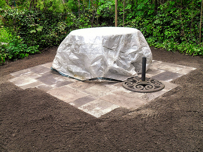 Unser Vorschlag: Wir ersetzen einen Teil der Rasenfläche durch Steinplatten und schaffen so einen ebenerdigen größeren Sitzplatz.