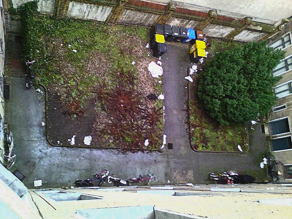 Aus der Mieterperspektive "von oben" wird die trostlose Ausgangssituation deutlich: Die Bepflanzung ist nicht mehr sonderlich attraktiv, die Wege sind schadhaft, und es fehlen geeignete Abstellflächen für Fahrräder.