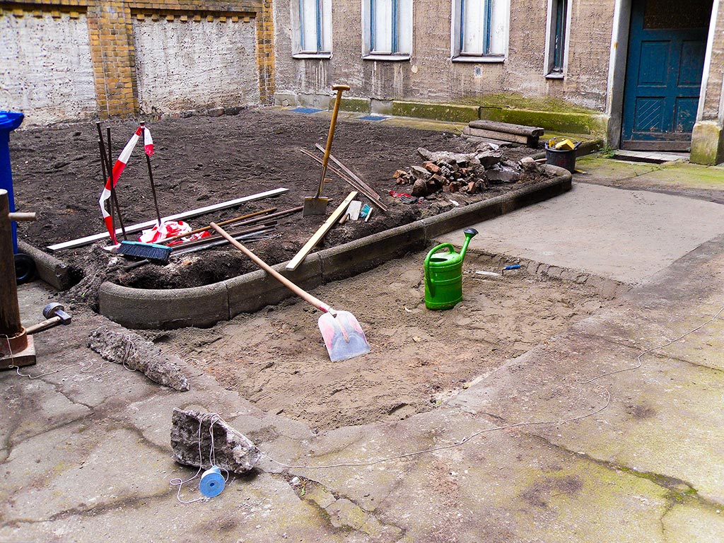 In Arbeit: großflächige Ausbesserung des Hofbelages, die Beet-Einfassungskanten wurden neu gesetzt und aus den tiefengelockerten Erdbereichen wurden weitere Fundamentreste ausgraben