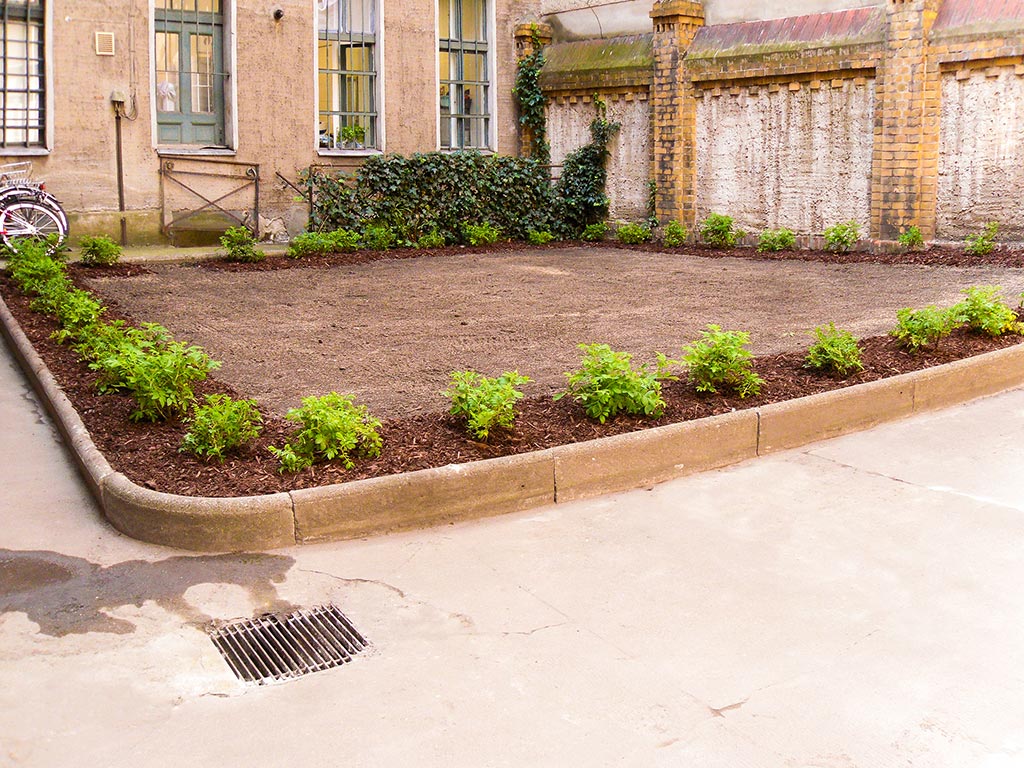 An diesem typischen Innenhof eines Berliner Altbaus hat der Zahn der Zeit genagt: Der alte Bodenbelag aus Beton ist rissig und brüchig geworden, die Beeteinfassungen stehen schief, und die Bepflanzung ist im Lauf der Jahre verwildert.