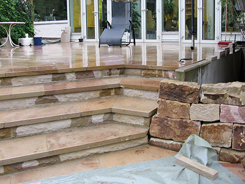 Eine besondere Herausforderung war es, das große Gefälle zwischen Haus und Garten zu überwinden. Dies sollte auf Wunsch des Bauherren in Form einer zweistufigen Terrasse geschehen, die von Natursteinmauern begrenzt und gestützt wird. Auf der oberen Terrasse am Haus wurden 80qm Sandsteinplatten verlegt.
